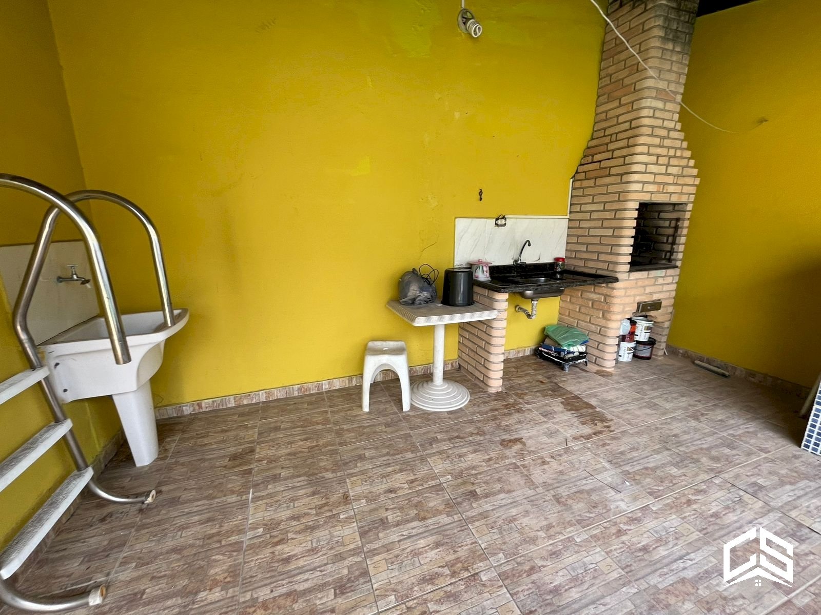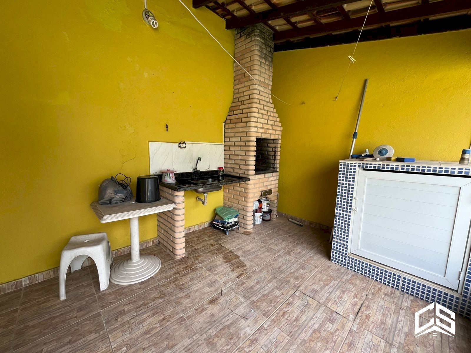 Área gourmet coberta com churrasqueira e pia