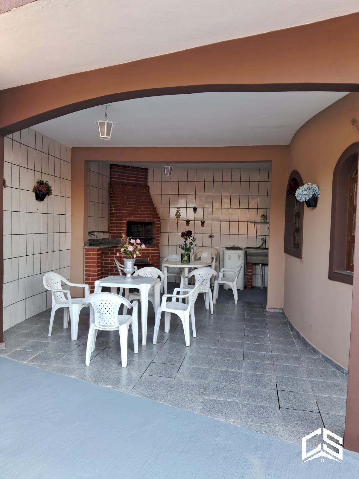 Área gourmet coberta com churrasqueira e pia