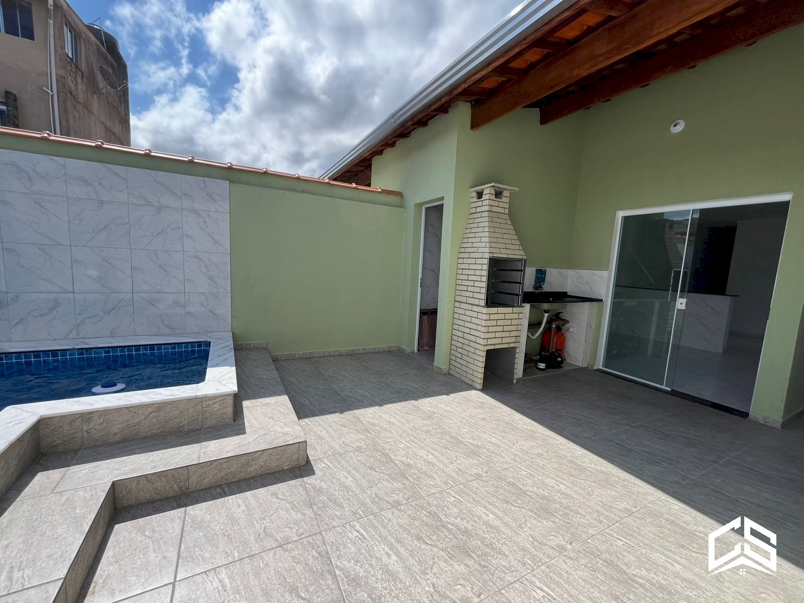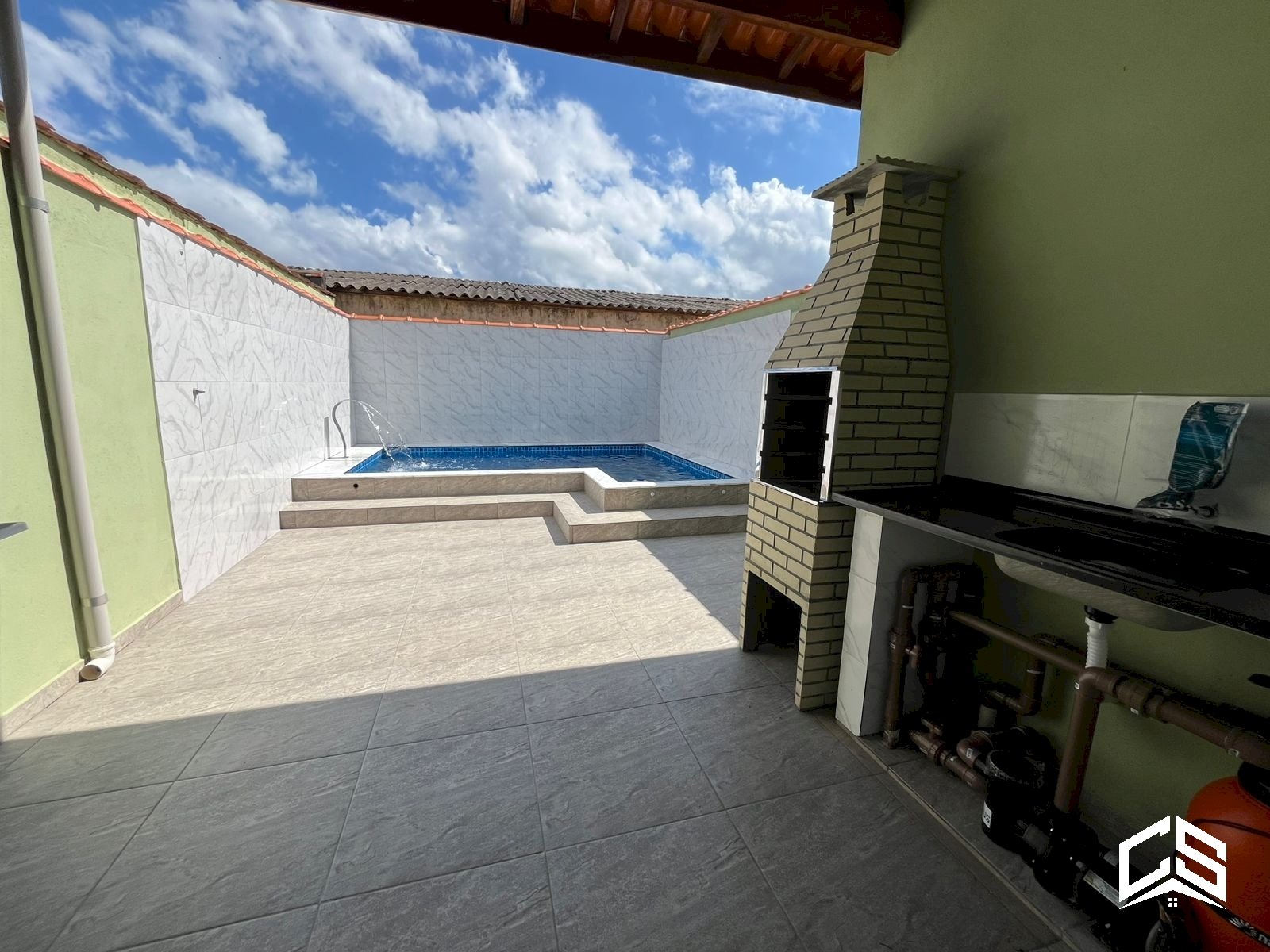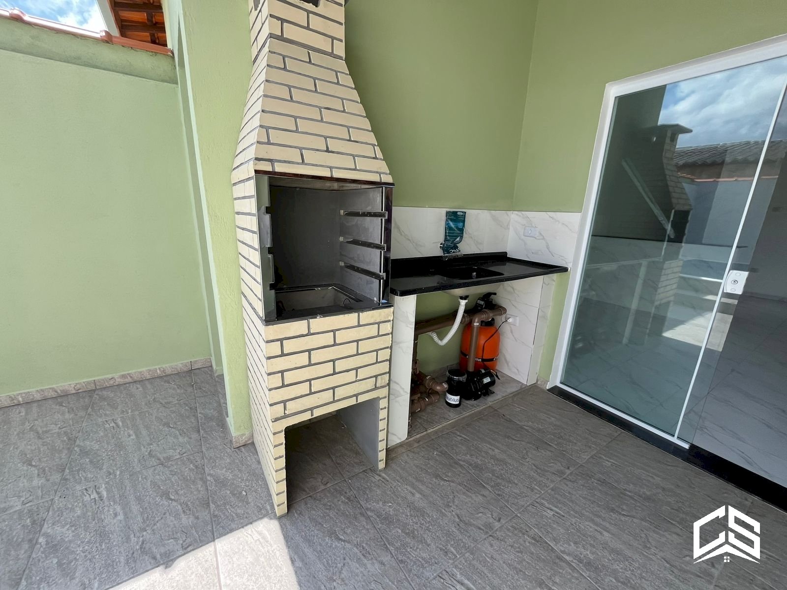 Área gourmet coberta com churrasqueira e pia