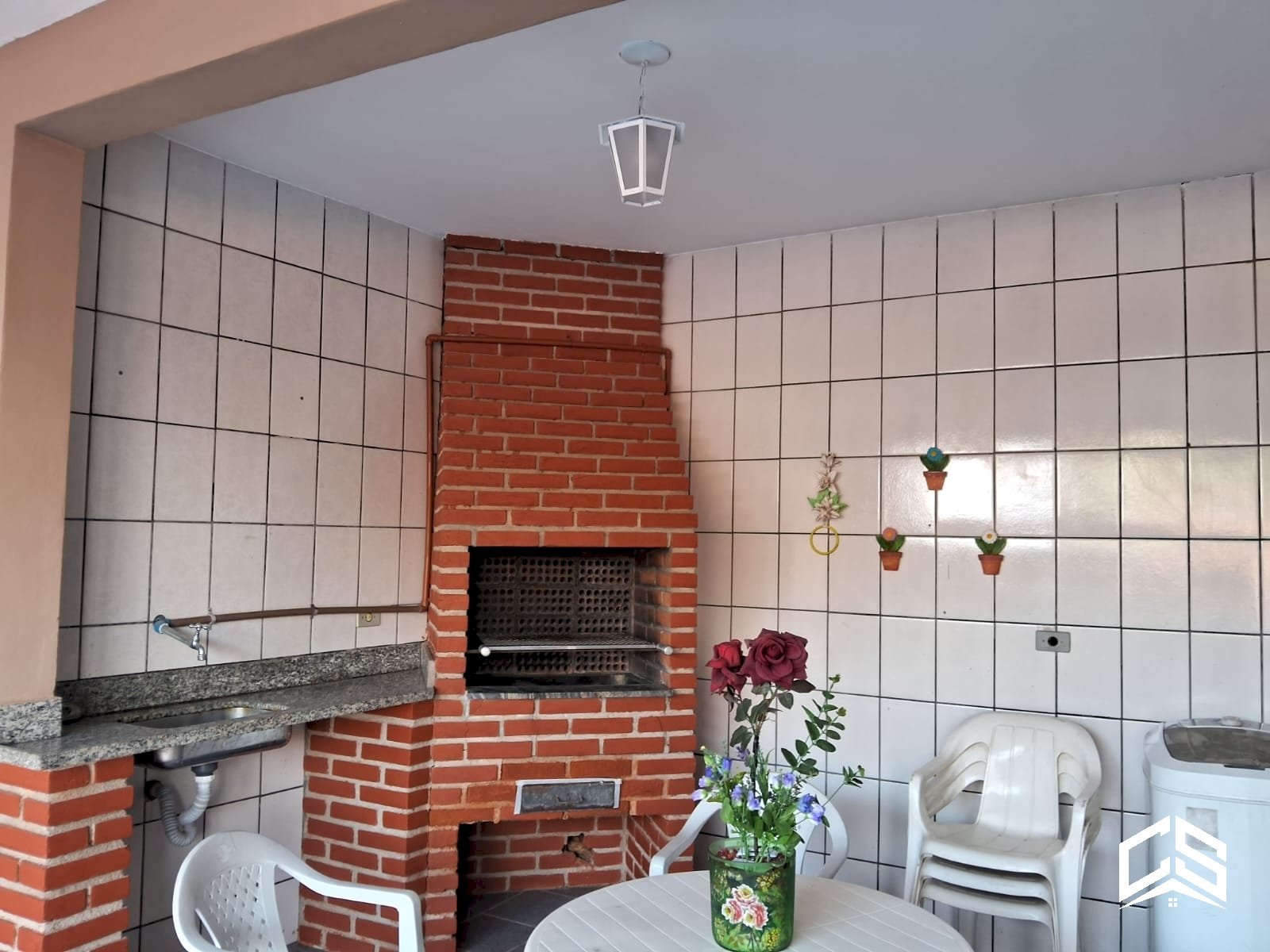 Área gourmet coberta com churrasqueira e pia